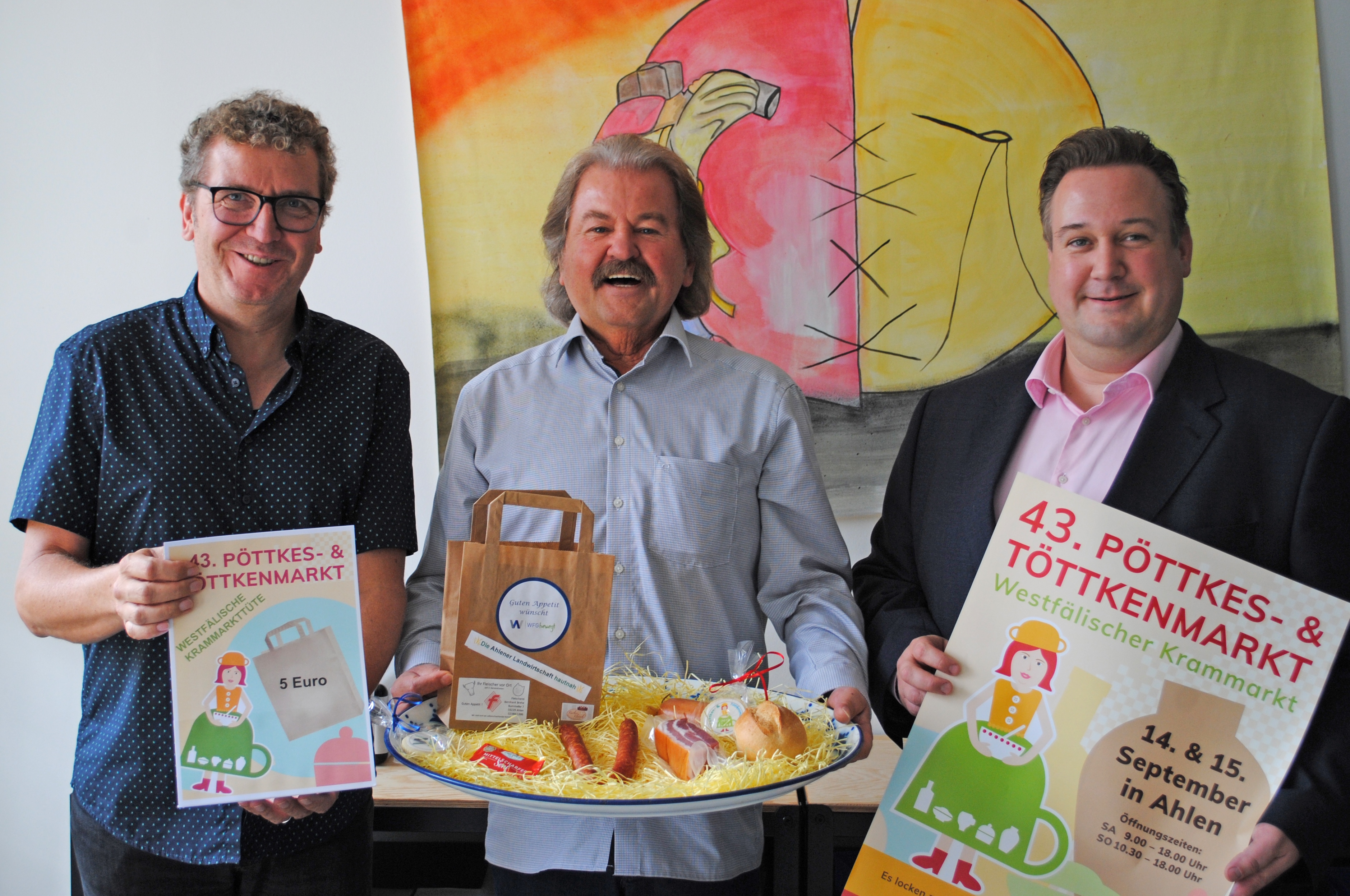 Bild: Carlo Pinnschmidt (WFG Ahlen mbH), Hans-Georg Smeilus (WFG Ahlen mbH) und Timm Ostendorf (1. Vorsitzender Pro Ahlen e.V.) laden zum 43. Pöttkes- und Töttkenmarkt ein.
