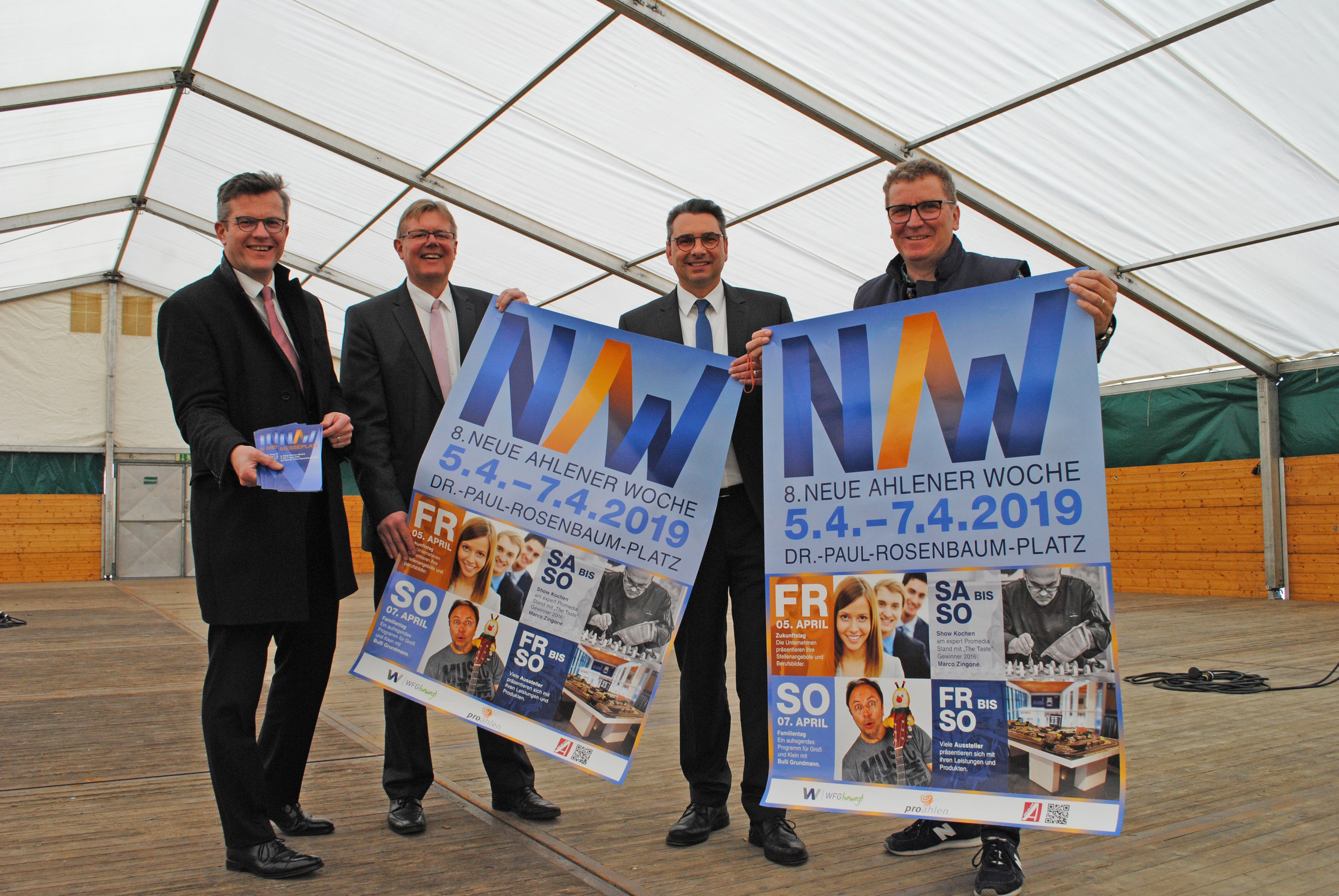 „Wir sind uns sicher, dass wir dadurch die Verweildauer auf dem Messegelände für alle Besucherinnern und Besucher erhöhen“, sind sich Bürgermeister Dr. Alexander Berger, WFG-Messe-Organisator Carlo Pinnschmidt und die beiden Pro Ahlen-Vertreter Peter Schmidt und Bernd Münstermann beim Pressetermin am Montagmittag einig.