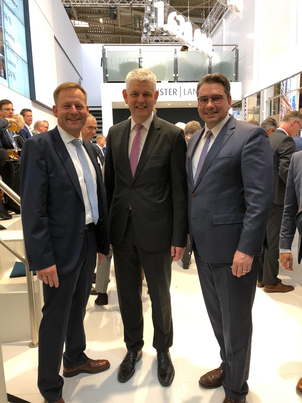 „Wir hatten die neuen Gewerbeflächen im Natur- und Gewerbepark Olfetal im Gepäck. Bei der Messe ging es darum, diese den Projektentwicklern vorzustellen und frühzeitig ins Gespräch mit potentiellen Interessenten zu kommen“, so Jörg Hakenesch. Offene Fragen der Interessenten konnten dabei im direkten Austausch mit Wirtschaftsförderung und Stadtplanung geklärt werden. Dabei ist die EXPO Real auch immer ein Netzwerktreffen relevanter Akteure der Region. Nicht nur Investoren zeigten sich bzgl. der neuen Gewerbeausweisungen in Ahlen interessiert, sondern auch Christoph Dammermann, Staatssekretär im NRW-Wirtschaftsministerium. Bürgermeister Dr. Berger und Stadtbaurat Mentz nutzten die Gelegenheit, um sich mit Dammermann über die neuesten Entwicklungen in der Region auszutauschen.
