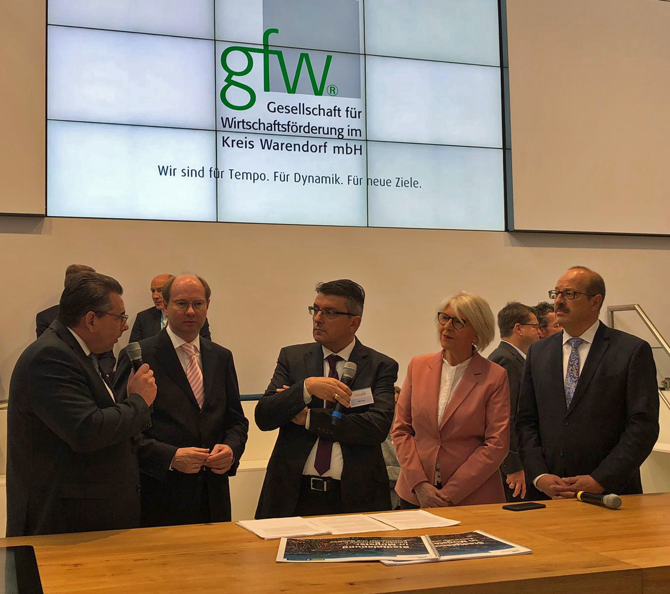 Unter dem Titel „Smart Country Kreis Warendorf“ ging es dann am Messestand des Münsterlandes um Glasfaserausbau und Digitalisierung in der Region. Bürgermeister Dr. Alexander Berger hob in der Talkrunde der Kreiswirtschaftsförderung die Investitionen von rund fünf Millionen Euro in ein digitales Schulnetz in Ahlen hervor. Gemeinsam mit Drensteinfurts Bürgermeister Carsten Grawunder war er sich einig, dass Investitionen in Breitbandausbau und Digitalisierung unabdingbar sind, um Menschen einen attraktiven Lebens- und Arbeitsort zu bieten. „Zukunft gehört denen, die die digitale Welt gestalten. Daher führen wir in Ahlen-Dolberg einen Breitbandausbau in Eigenregie durch, um Gewerbe und Wohnen mit schnellem Internet zu versorgen“, skizzierte Berger die Bemühungen für schnelles Internet.