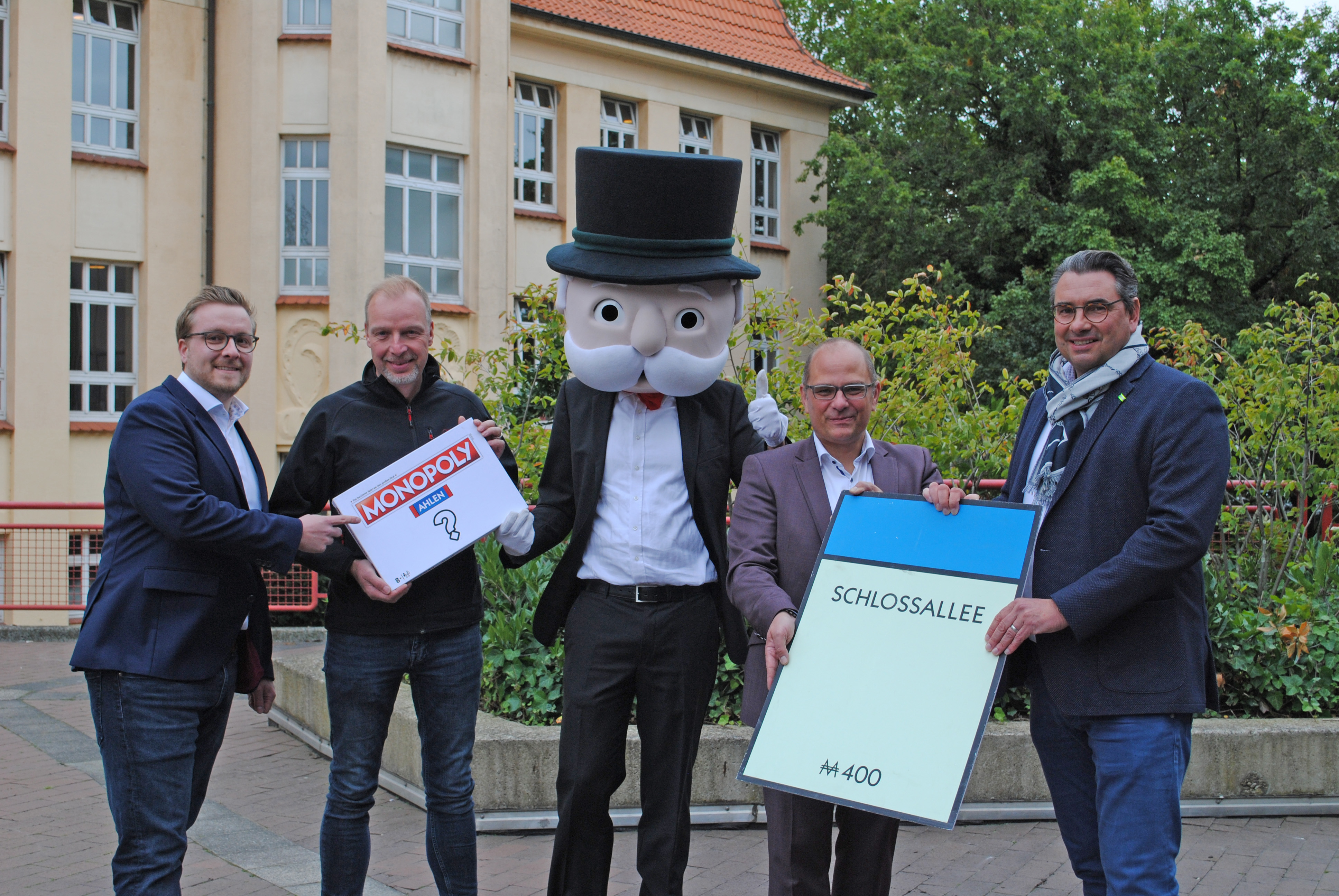Foto: (v.l.) Projektleiter Lars Normann, Initiator Markus Schier, Mr. Monopoly, WFG-Geschäftsführer Jörg Hakenesch und Bürgermeister Dr. Alexander Berger