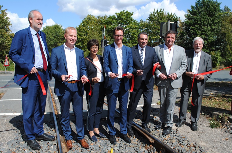 Das symbolische Band durchschnitten (v.l.) André Pieperjohanns (Westfälische Landeseisenbahn), Henning Rehbaum (MdL), Annette Watermann-Krass (MdL), NRW-Verkehrsminister Hendrik Wüst, Bürgermeister Dr. Alexander Berger, Wilhelm Haver (Unternehmer) und Franz-Josef Buschkamp als Mitinitiator
