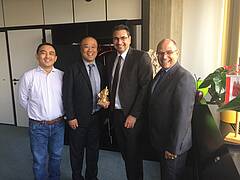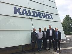 Bild oben: v.l.n.r: Jiang Dazhi, Yu Lei, Dr. Alexander Berger, Jörg Hakenesch // Bild unten:v.l.n.r: Jörg Hakenesch, Jiang Dazhi, Yu Lei, Björn Zimmermann (Area Manager Franz Kaldewei GmbH & Co. KG), Thorben Welte (WFG Ahlen)