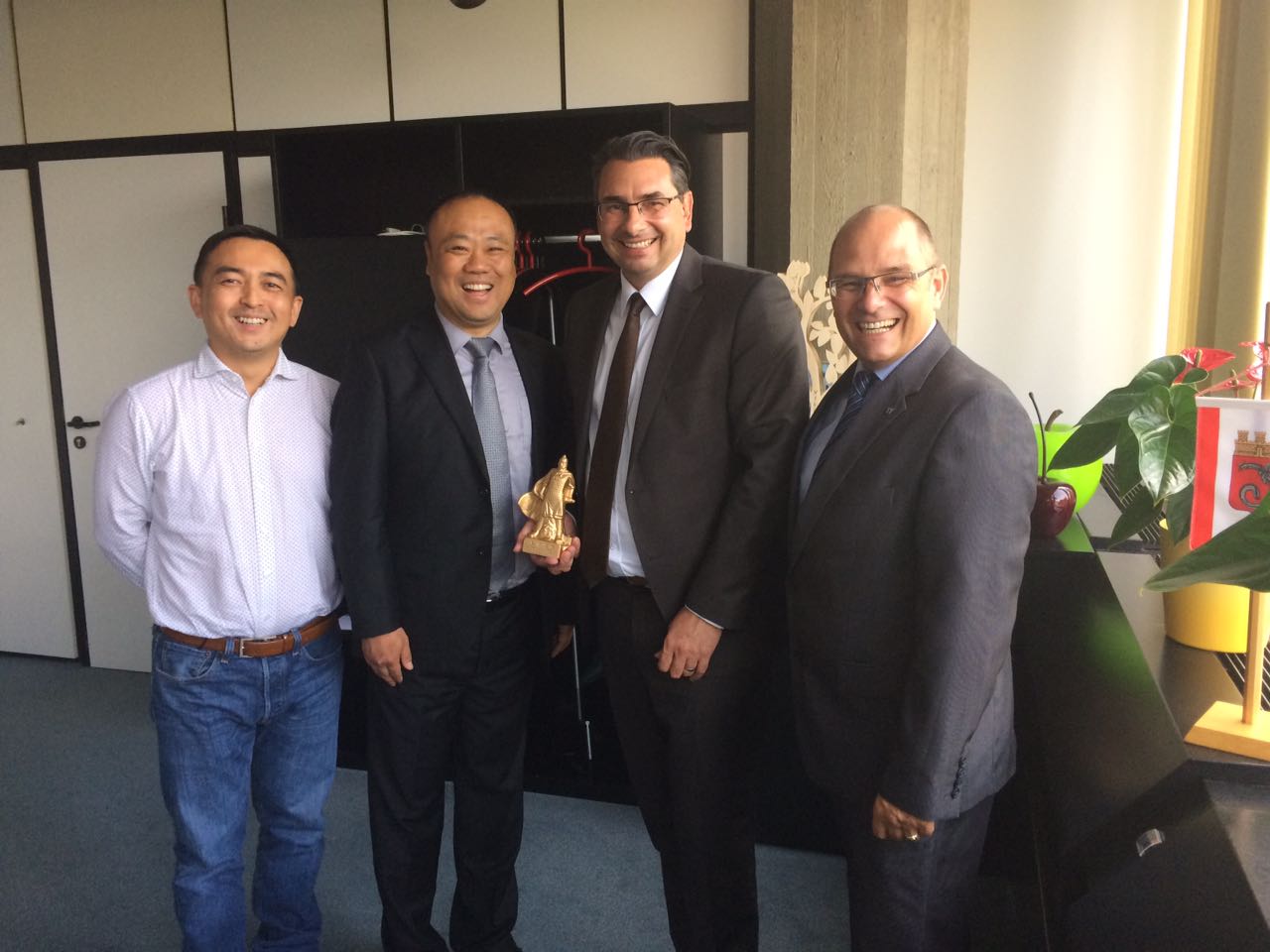Im Anschluss an die Werksführung empfing Bürgermeister Dr. Alexander Berger die Wirtschaftsgäste zu einem Gespräch im Rathaus. Von Yu Lei, der mit der China Fortune Land Development Group (CFLD) einen an der Shanghaier Börse gelisteten Betreiber von rund sechzig Industrieparks in China vertritt, erfuhr Berger vom großen Interesse chinesischer Investoren, in Europa Fuß zu fassen. Erst kürzlich wurde bekannt, dass China im Hamburger Hafen einen neuen Containerterminal mit Logistikzentrum errichten will. „Die Entfernungen zwischen den Märkten werden immer geringer, so dass man gut beraten ist, langfristig Entwicklungen im Blick zu behalten“, sieht auch Ahlens Bürgermeister für die heimische Wirtschaft gute Perspektiven in Asien. „Wir freuen uns über ihr Interesse am Standort Ahlen. Auch unsererseits besteht eine große Neugier auf China“, betonte Berger die Be-deutung des deutsch-chinesischen Kontaktes im Gespräch mit Yu Lei und Jiang Dazhi, dem Deutschlandrepräsentanten der Wirtschaftsregion Xuzhou.