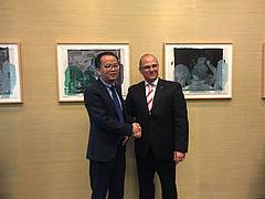 Pujiangs Bürgermeister Xu und WFG-Geschäftsführer Jörg Hakenesch am Rande der Konferenz „Perspektiven und Investmentchancen im Südwesten Chinas“.