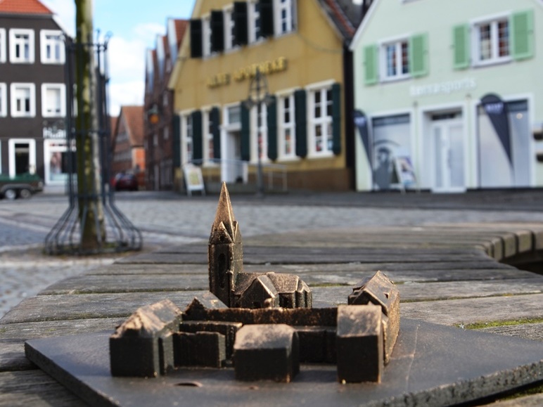 Barrierefrei und außerordentlich lehrreich ist das Stadtmodell aus Bronze, das ab November den neugestalteten Marktplatz schmücken wird. Stadt und Förderer haben jetzt gemeinsam mit Künstler Felix Broerken einen ersten Vorgeschmack darauf gegeben, was auf 1,20 mal 1,30 Meter auf der von Platanen umsäumten Platzmitte entsteht.