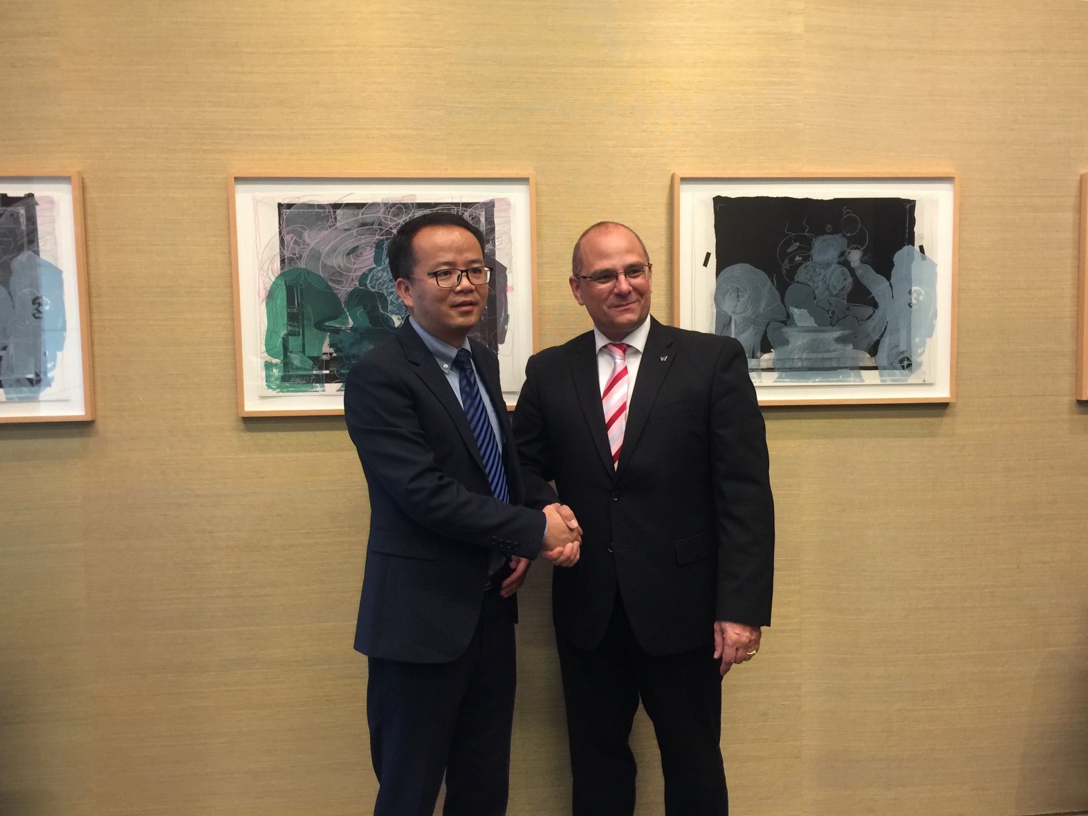Pujiangs Bürgermeister Jing Xu (l.) und WFG-Geschäftsführer Jörg Hakenesch am Rande der Konferenz „Perspektiven und Investmentchancen im Südwesten Chinas“ im Oktober 2017.