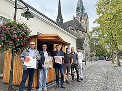 Die Vorbereitungen von WFG, BAS und städtischen Handwerkern laufen auf Hochtouren: v.l. Stefan Deimann (WFG-Geschäftsführer), Carlo Pinnschmidt (WFG-Stadtmarketing), Ronald Zent (BAS), Handwerker Christian Splett, Stefan Krampe und Josef Cicek.