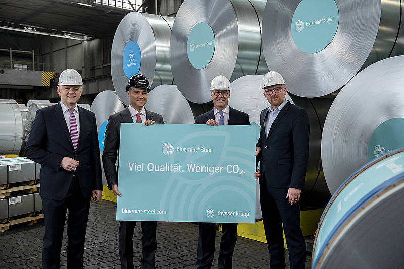 v.l.n.r: Christoph Dammermann (Staatssekretär im Ministerium für Wirtschaft, Innovation, Digitalisierung und Energie), Franz Kaldewei (CEO Franz Kaldewei GmbH & Co. KG), Bernhard Osburg (Vorstandsvorsitzender thyssenkrupp Steel), Sören Link (Oberbürgermeister der Stadt Duisburg)