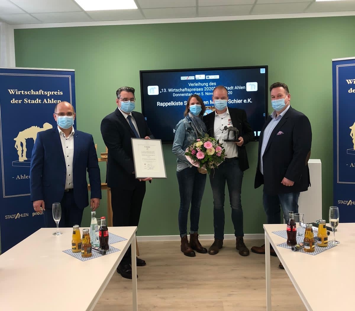 Ahlen. Der Rahmen war bewusst klein gewählt, die Freude dafür umso größer: Aus den Händen von Bürgermeister Dr. Alexander Berger, dem Pro Ahlen-Vorsitzenden Timm Ostendorf und WFG-Geschäftsführer Jörg Hakenesch erhielt die Rappelkiste den „Wirtschaftspreis der Stadt Ahlen“.