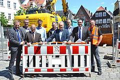 Gaben das Signal zum Marktplatzumbau: v.l. Andreas Mentz, Carlo Pinnschmidt, Jörg Hakenesch, Robert Reminghorst, Dieter Sievers (Bauleiter Ahlener Umweltbetriebe), Hans Jürgen Tröger, Bernd Döding, Dr. Alexander Berger, Rüdiger Bumann (Firma Riesenbeck).