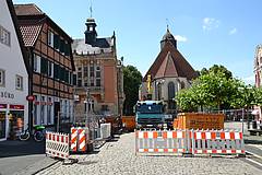In den kommenden anderthalb Jahren wird der Marktplatz sein Gesicht komplett verändern. In „rekordverdächtiger Zeit“, so Stadtbaurat Andreas Mentz, seien vom ersten Aufschlag bis zum Baubeginn alle notwendigen Voraussetzungen geschaffen worden. „Im Vergleich zu anderen Städten eine gute Ausgangsbasis“, wie Mentz findet.