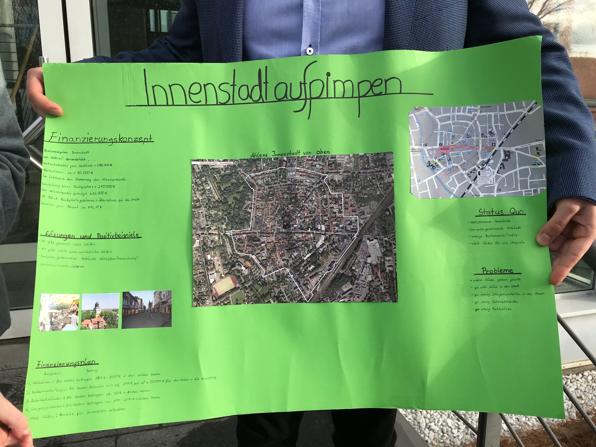 Dazu wurde die Klasse in sechs Teams eingeteilt, die sich jeweils mit einem selbstgewählten kommunalen Handlungsfeld auseinandersetzten: Wie kann man das politische, bzw. das soziale Engagement Jugendlicher stärken? Wie kann man die Integration verbessern? Was kann man gegen die Vereinsamung älterer Alleinlebender tun? Wie kann man die Kinderbetreuung optimieren? Durch welche Maßnahmen lässt sich das Sicherheitsgefühl noch weiter steigern? Und schließlich: Wie kann die Innenstadt aufgewertet werden?