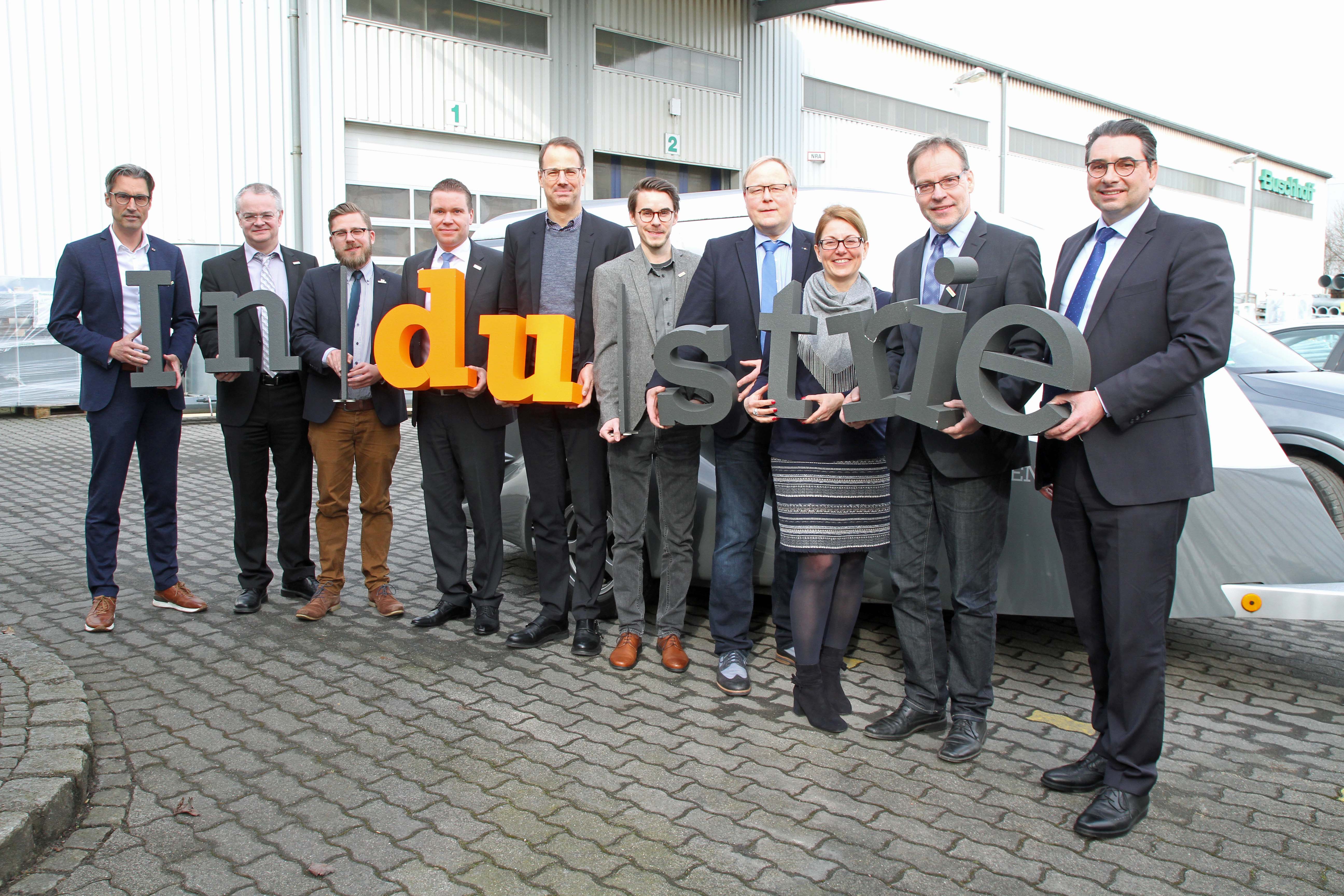 Initiative In|du|strie Ahlen: Thomas Heuser (herotec GmbH Flächenheizung), Dr. Eckhard Göske (IHK Nordwestfalen), Thorben Welte (WFG Ahlen mbH), Dr. Christian Buschhoff (Maschinenfabrik Th. Buschhoff GmbH & Co. KG), Oliver Reimann (Leifeld Metal Spinning AG), Kilian Leufker (IHK Nordwestfalen), Jörg Arntzen (Dow Deutschland Anlagengesellschaft mbH, Werk Ahlen), Silvia Sörensen (PMS GmbH & Co. KG), Jürgen Henke (Metallwerke Renner GmbH) und Bürgermeister Dr. Alexander Berger. Zudem gehört dem Verbund noch die Firma HMV Metallverarbeitung GmbH & Co. KG mit ihrem Geschäftsführer Roland Austrup an. (Bildquelle, Harke AZ)