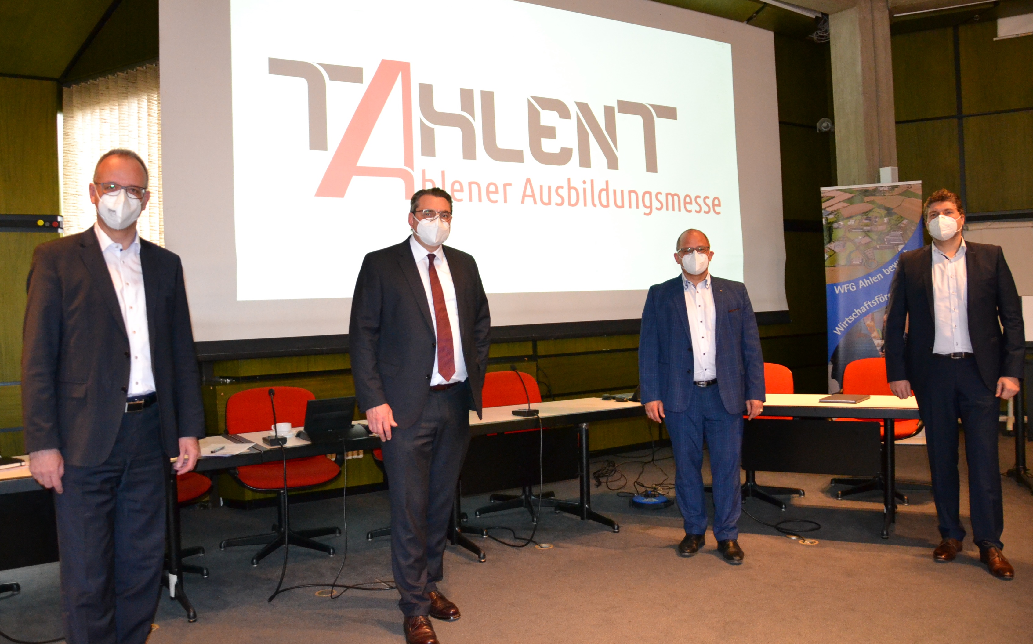 Frisch, modern und für Jugendliche ansprechend gestaltet wird das neue Format aussehen, berichteten Jörg Hakenesch, Geschäftsführer der Wirtschaftsförderung Ahlen und Joachim Fahnemann, Leiter der Agentur für Arbeit Ahlen-Münster. Sie stellten die digitale Ahlener Ausbildungsmesse TAHLENT gemeinsam mit dem Ahlener Bürgermeister, Dr. Alexander Berger, in einer Pressekonferenz im Ahlener Rathaus vor. „Die Ahlener Ausbildungsmesse hat sich über die Jahre zu einer Veranstaltung mit einer hohen Attraktivität und Strahlkraft entwickelt“, sagte Dr. Berger und betonte: „Hier finden Ahlener Unternehmen und Jugendliche zusammen. Wir möchten deshalb auch unter den aktuell durch Corona erschwerten Bedingungen eine Plattform bieten, die Jugendlichen berufliche Wege zeigt und ihnen gemeinsam mit den heimischen Unternehmen einen guten Einstieg in die Arbeitswelt ermöglicht“.