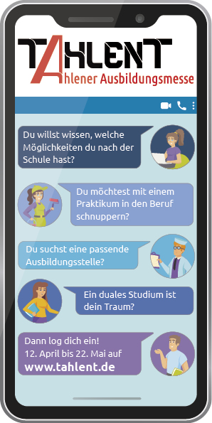 Selten war es so einfach Kontakt mit den Ausbildungsbetrieben der Region aufzunehmen. Auf der digitalen Ausbildungsmesse TAHLENT können Jugendliche die Ausbildungsbetriebe der Region finden, sich über deren Ausbildungsberufe informieren und direkt Kontakt aufnehmen. Das alles, ohne das Haus oder die Wohnung verlassen zu müssen.