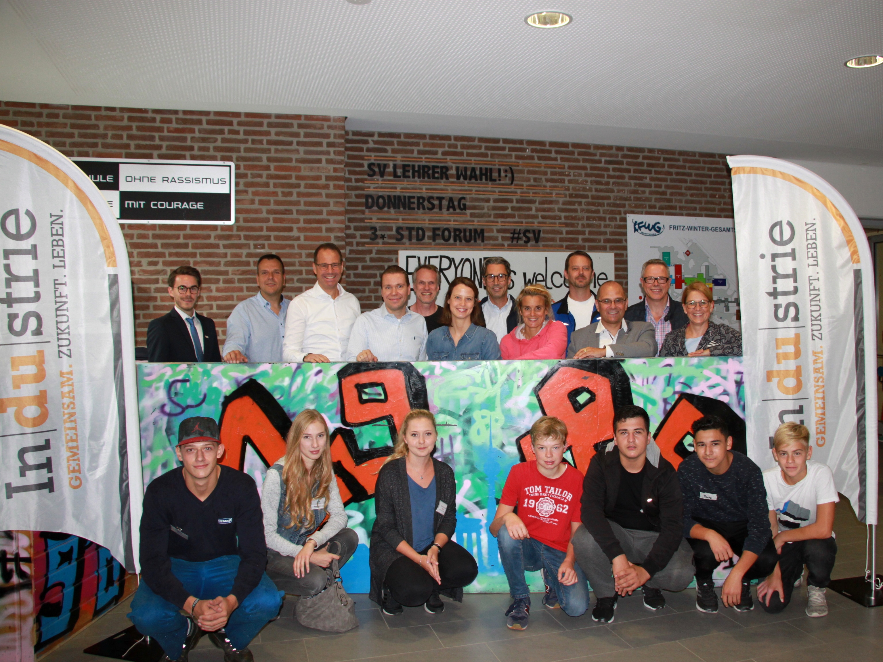 Ein nicht ganz alltägliches Bild vor dem Haupteingang der Fritz-Winter-Gesamtschule, wo sich 27 Auszubildende aus sieben verschiedenen Unternehmen Ahlens mit 30 Schülerinnen und Schüler der Jahrgangsstufe 9 trafen, um gemeinsam den ersten Social Day in Ahlen Realität werden zu lassen.