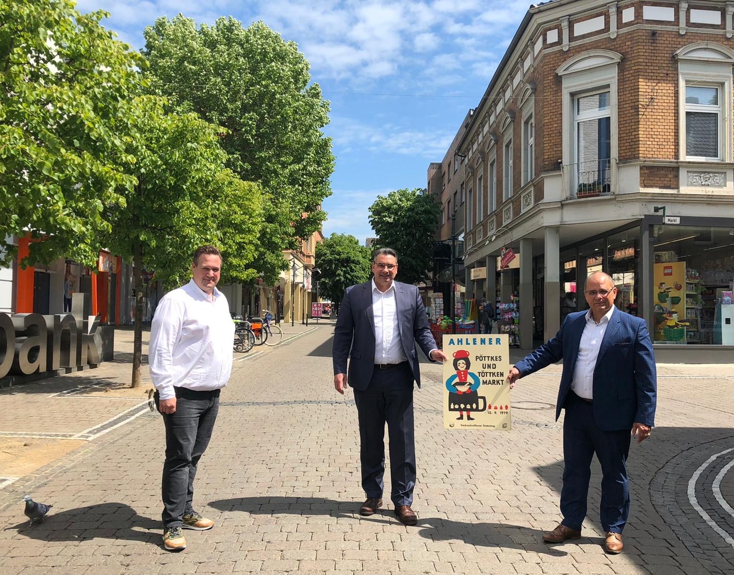 Foto v. l.: Timm Ostendorf (Pro Ahlen e.V.), Bürgermeister Dr. Alexander Berger und Jörg Hakenesch (WFG Geschäftsführer) mit einem der ersten Pöttkes- und Töttkenmarkt Plakate