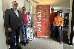 (v.l.) Stefan Deimann (WFG-Geschäftsführer), Burkhardt Engelke (Weltladen) Carlo Pinnschmidt (Stadtmarketing) Karla Grawinkel (Weltladen)