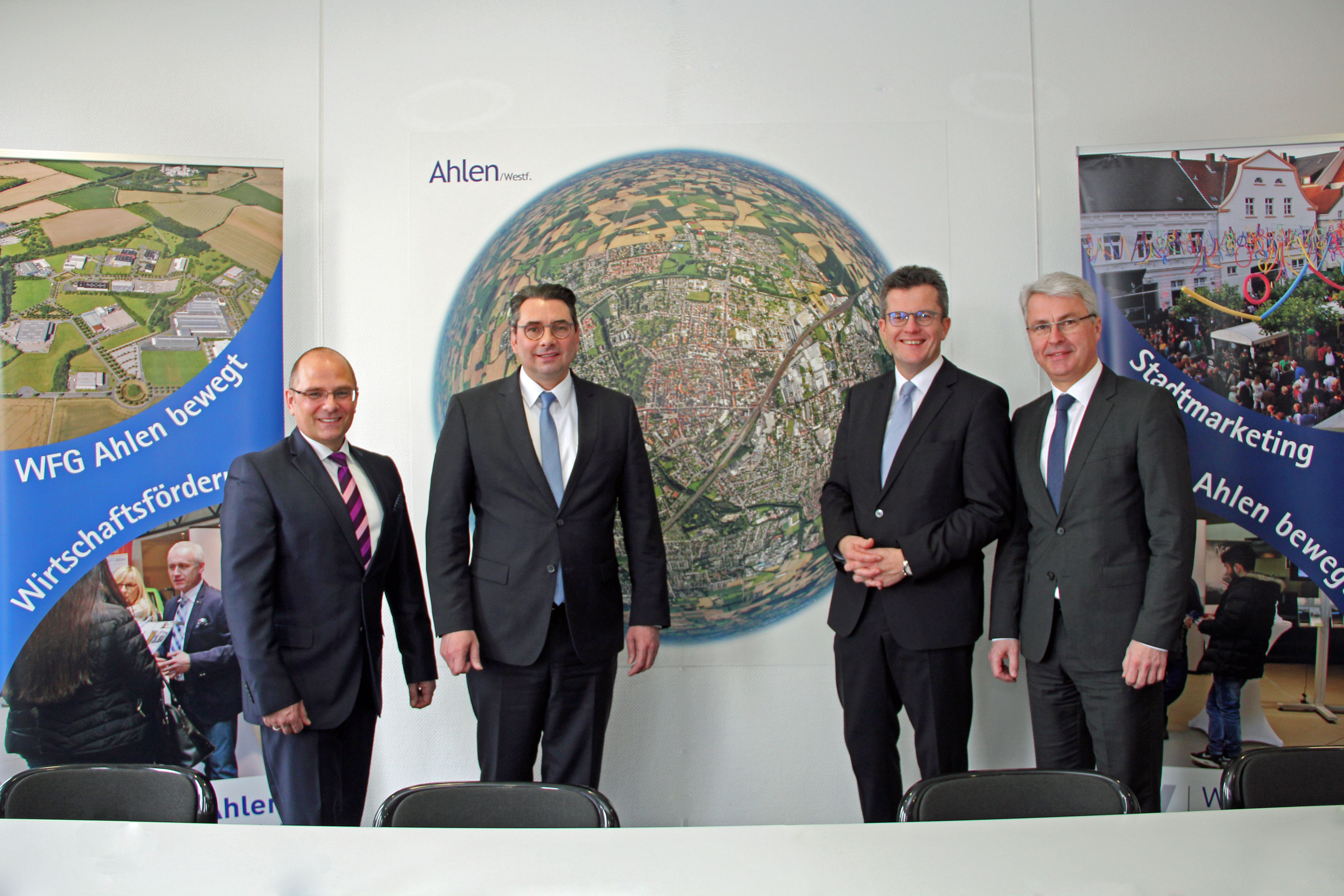 Stellten das Jahr 2018 vor: Jörg Hakenesch (Geschäftsführer WFG Ahlen mbH) und die WFG-Gesellschafter Bürgermeister Dr. Alexander Berger (Stadt Ahlen), Peter Schmidt (Pro Ahlen e.V.) und Michael Vorderbrüggen (Volksbank eG)