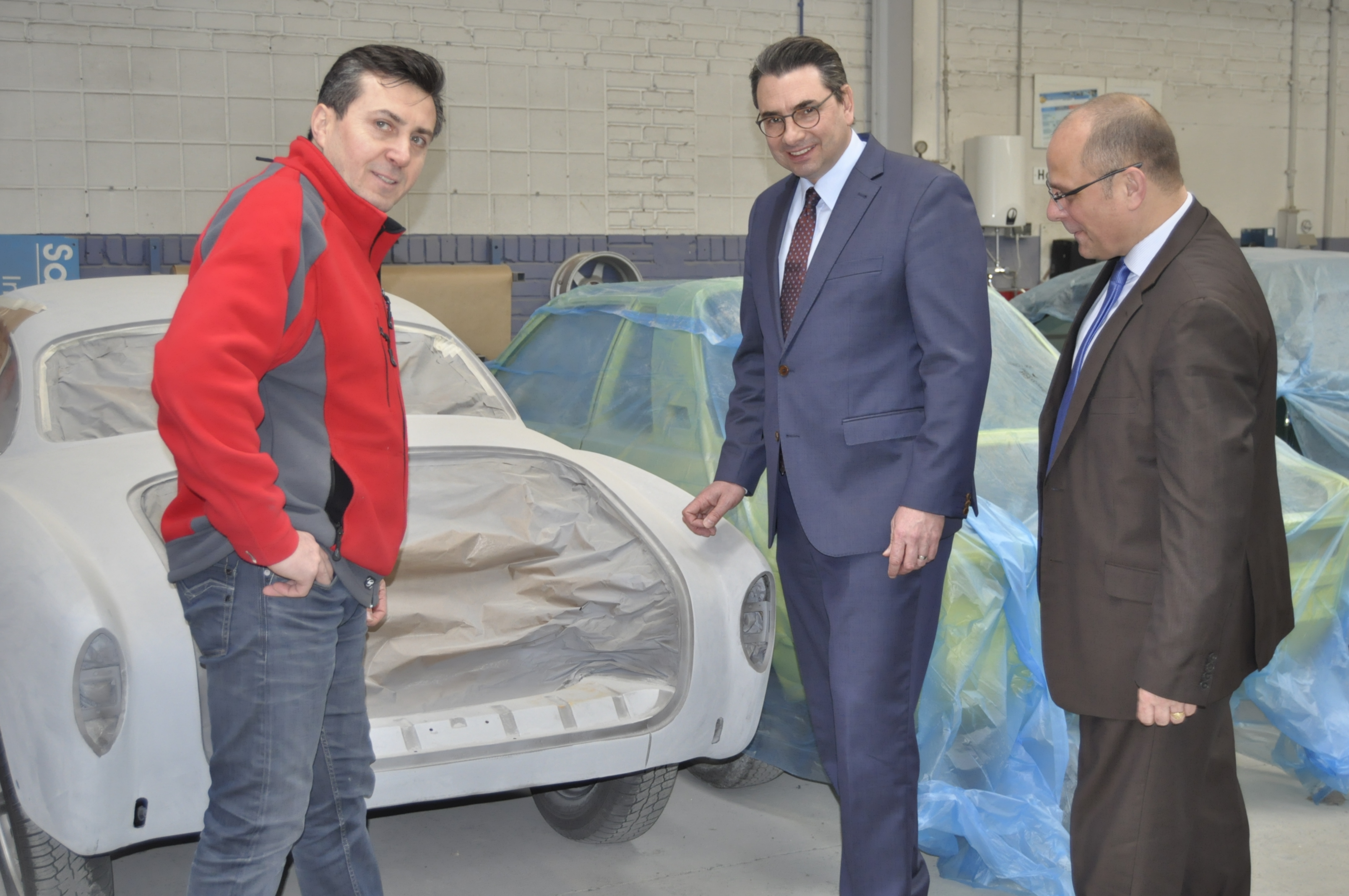 Das Thema Ausbildung war auch beim zweiten Unternehmensbesuch auf der Gesprächsagenda. Auch der Karosserie- und Lackierbetrieb Ayhan Pür setzt auf den Nachwuchs. Als zertifizierter Ausbildungsbetrieb mit 13 Mitarbeitern, ist auch hier dauerhaft ein Auszubildender mit im Team. Dabei ist das Leistungsspektrum von Pür äußerst umfangreich: „Von den Karosseriearbeiten und lackierfreiem Ausbeulen über Unfallinstandsetzung und Autoglasservice bis hin zu Fahrzeuglackierungen und Fahrzeugaufbereitung reicht unser Angebot. Wir arbeiten auch seit langem eng mit Versicherungen zusammen und haben uns auch auf die Aufarbeitung von Oldtimern spezialisiert“, so Ayhan Pür, Meister und Inhaber des Betriebes an der Theodor-Schwarte-Straße. „Die Wirtschaft in Ahlen ist äußerst vielfältig. Nicht nur bei den großen Betrieben kann man eine tolle Ausbildung machen, insbesondere unsere kleinen Unternehmen mit weniger als 50 Mitarbeitern bieten eine enorme Bandbreite an Berufsbildern an“, appelliert Berger an künftige Auszubildende auch die kleinen Ausbildungsbetrieb verstärkt in den Fokus zu nehmen.